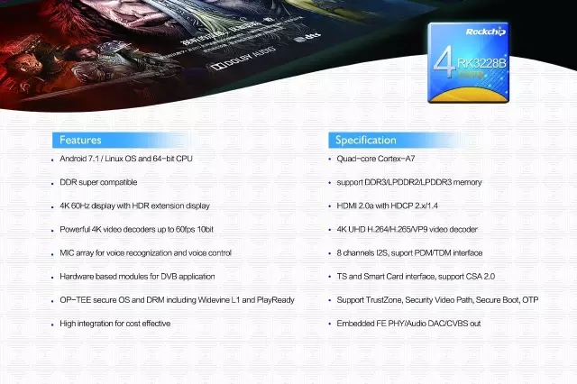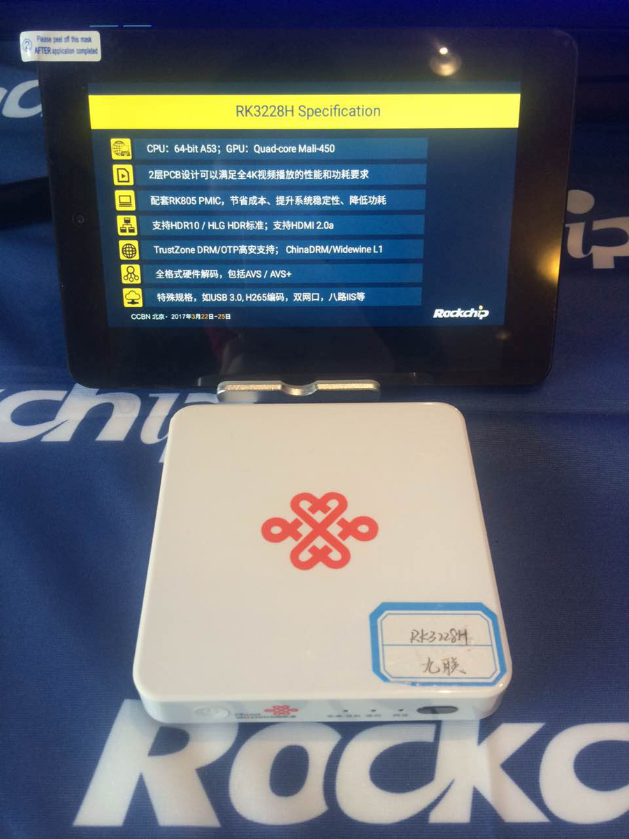 Rockchip在CCBN2017展出搭载四核超优性价比的机顶盒芯片产品RK3228B以及高性能的机顶盒芯片产品3228H。方案亮点涵盖: